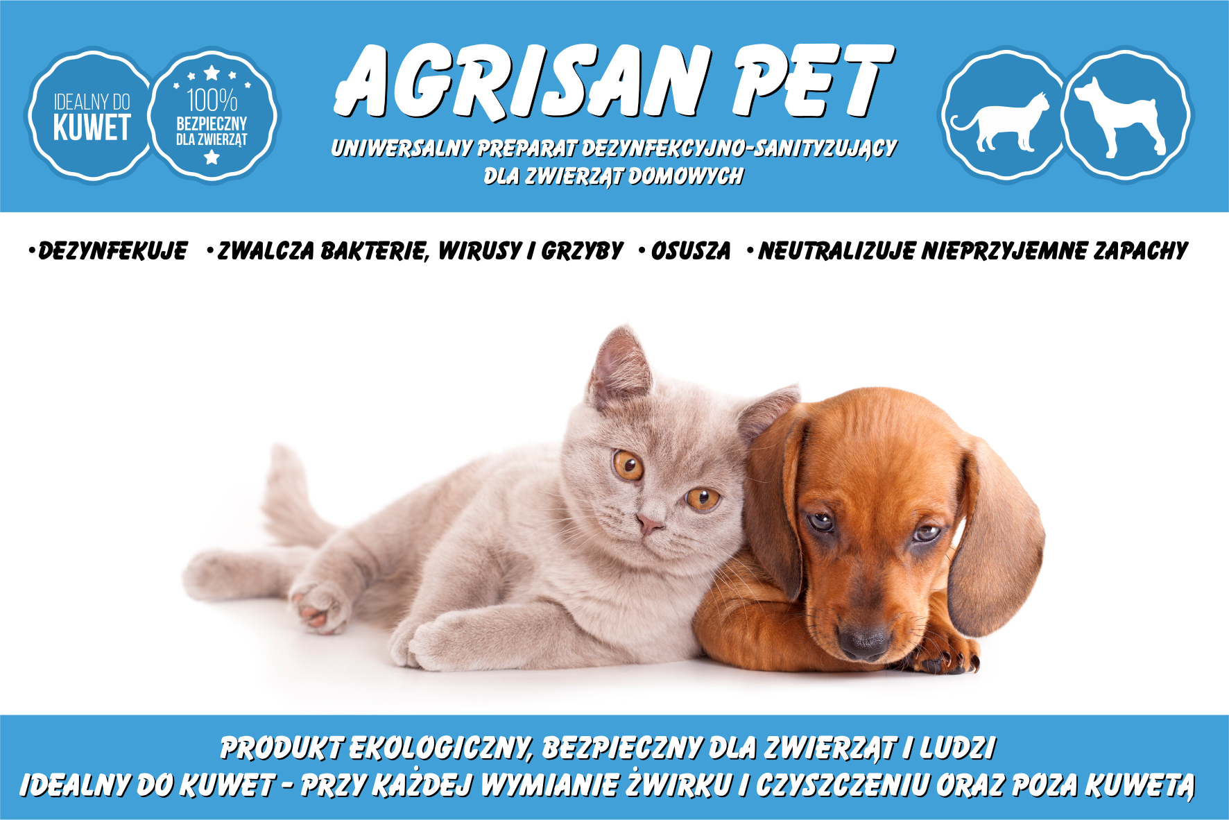 Skład: AGRISAN PET jest mineralnym preparatem wieloskładnikowym zawierającym sorbenty, składniki mineralne oraz kompozycje zapachowo-dezodorujące, olejki eteryczne.